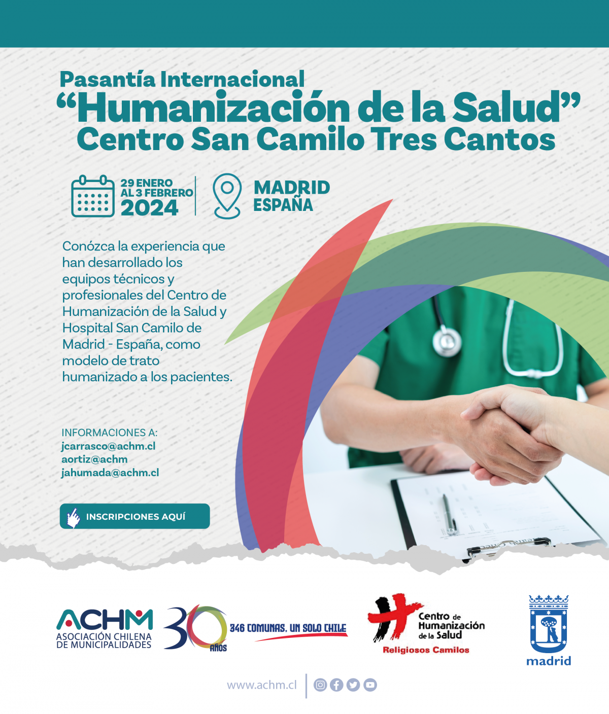 En enero, un grupo de alcaldes, de los que depende la atención primaria en salud en Chile, harán una pasantía en el Centro San Camilo, en Tres Cantos, conociendo estrategias de humanización y liderazgo. José Carlos Bermejo les impartirá una conferencia sobre "Liderazgo humanizado".