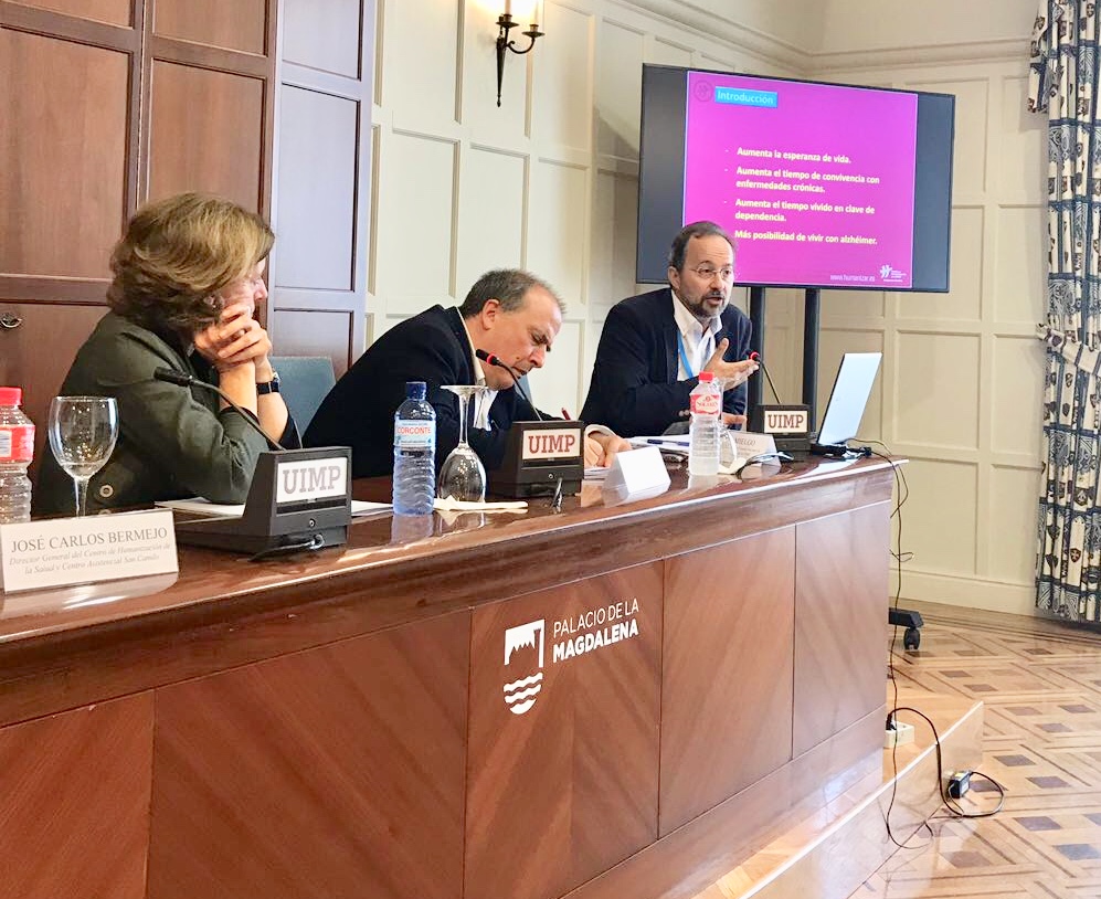 En el Palacio de la Magdalena de Santander, organizado por la Asociación Española de Fundaciones, José Carlos Bermejo ha participado en una mesa redonda en la que ha subrayado la necesidad de formarse en inteligencia espiritual, adquirir competencias espirituales para humanizar el cuidado a las personas mayores y al final de la vida. Además de competencias relacionales, emocionales, éticas y culturales, se requiere capacidad de gestionar el mundo del sentido último que las personas atribuimos al enfermar, necesitar cuidados y aproximarse el final. Un desafío al que el Centro de Humanización de la Salud sale al paso con acciones formativas tipo Jornadas, formación continua y másters con la Universidad Ramón Llull.