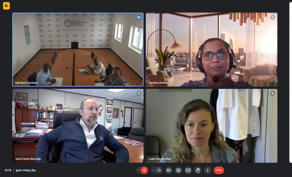 La Escuela Universitaria católica de Cabo Verde, con sus directivos, Director - Pe. José Eduardo Alfonso (director), Joseane Almeida (Departamento de Projetos e Coordenação de Centro de Psicologia) y Janaína Vicente, se reúnen con los directivos del Centro de Humanización de la Salud (Centro de Escucha, José Carlos Bermejo) y coordinadora de la Red de Centros de Escucha, Luján Gómez, planificando la alianza de colaboración en torno al Centro de bienestar psico-espiritual naciente en Cabo Verde.