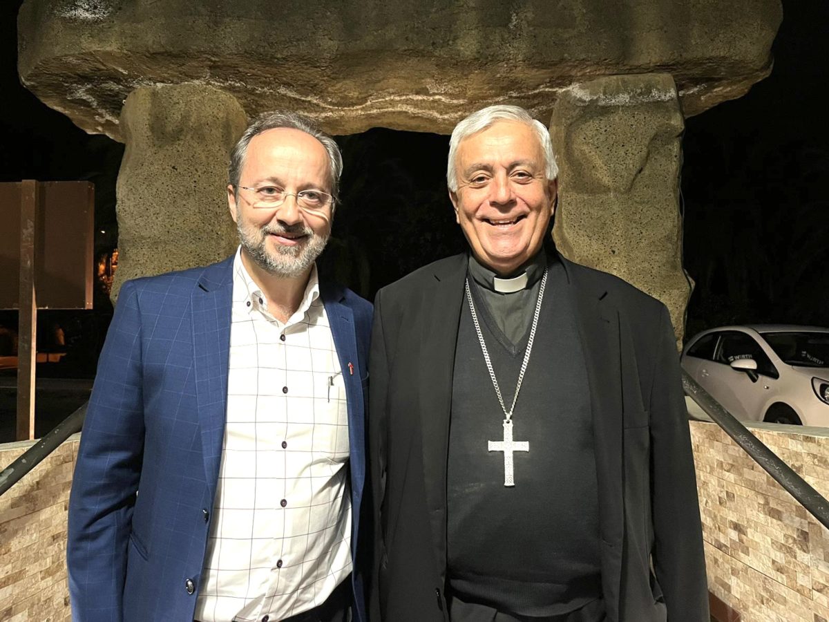 Camilos en La Palma D. Bernardo Alvarez, obispo de La Palma, agradece a José Carlos Bermejo la labor de los camilos en la isla después del volcán desde el Centro de Escucha y la Unidad Móvil. VOLVER
