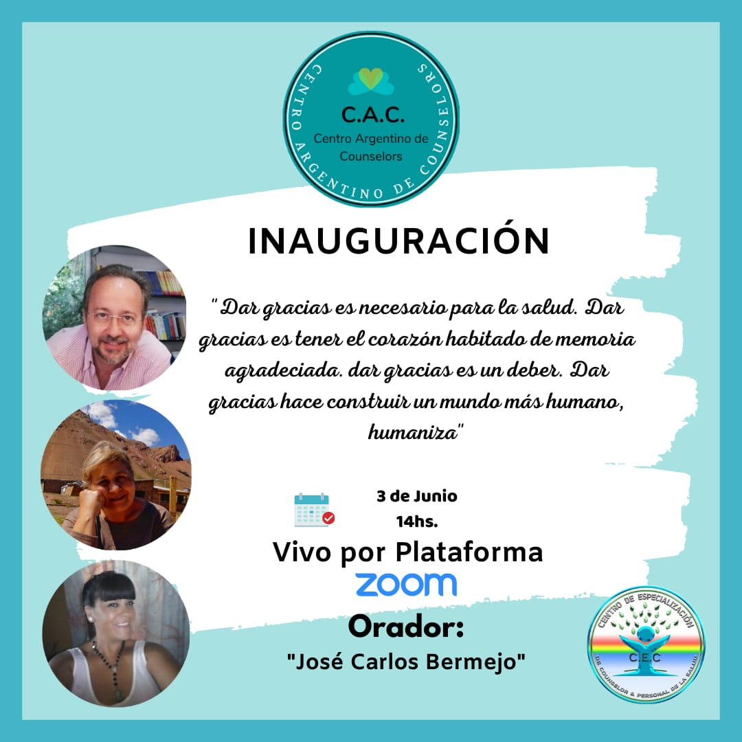 Con ocasión de la Inauguración del Centro Argentino de Counselors, José Carlos Bermejo impartirá una conferencia sobre "el poder de la palabra". Argentina promueve el counselling profesional. En España se estudia counselling en Barcelona, Valencia (on-line) y Tres Cantos, Madrid, bajo la dirección de José Carlos Bermejo. Info en www.humanizar.es y 918060696