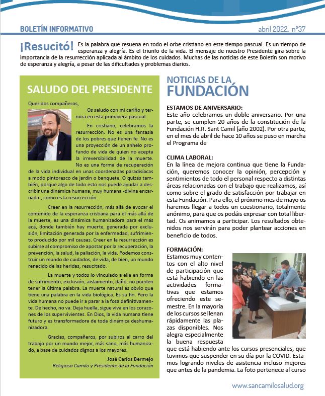 La Fundación Hospital Residencia San Camilo, Presidida por José Carlos Bermejo, presenta su boletín nº 37 de mes de abril donde presenta la vida y actividad en los diferentes Centros esparcidos por todo el territorio español.