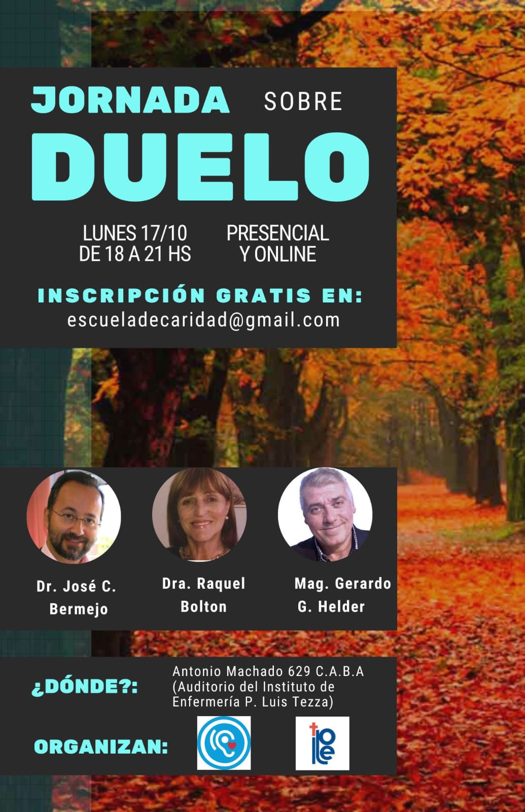 Duelo en Buenos Aires El 17 de octubre, en Buenos Aires (Argentina), José Carlos Bermejo impartirá una conferencia sobre duelo, en la C/ Antonio Machado 629, auditorio Luis Tezza. Inscripciones en escueladecaridad@gmail.com VOLVER