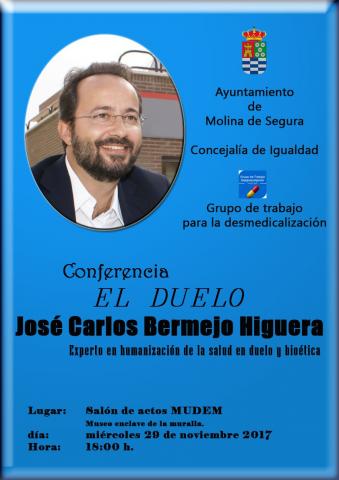 José Carlos Bermejo impartirá una conferencia solicitada por el municipio de Molina de Segura, Murcia, en la que contribuirá al programa que el ayuntamiento tiene en relación al consumo de fármacos innecesarios. Se pretende, abordando el tema del duelo, poner en relieve la necesidad de conocer y comprender el fenómeno para prevenir complicaciones en la salud y acompañar con competencias relacionales, reforzando los recursos personales y relacionales como privilegiados ante el sufrimiento que producen las pérdidas. Una conferencia abierta.