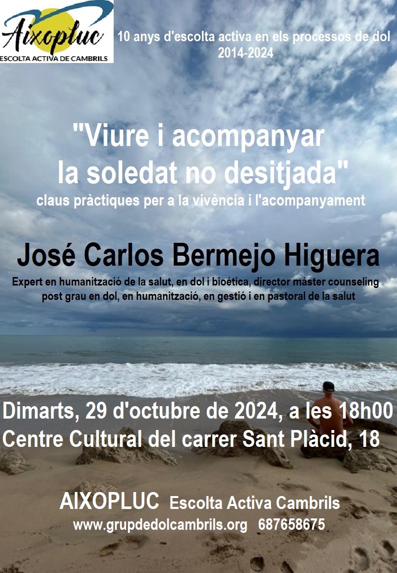 El Centro de Escucha de Cambrils (Tarragona) vuelve a invitar a José Carlos Bermejo, quien impartirá, tras 10 años de vida del Centro, una conferencia sobre la soledad no deseada, en el Centro cultural del Carrer Sant Plàcid, el 29 de octubre.