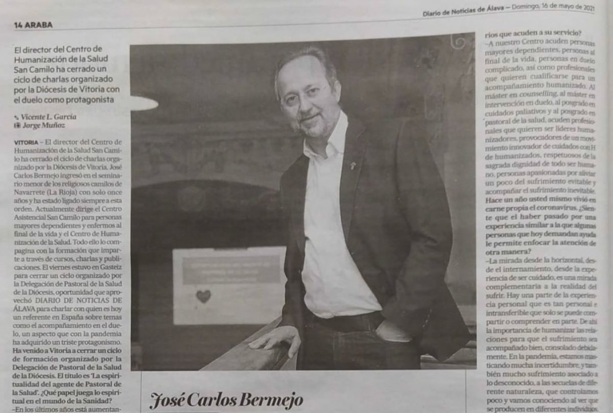 El diario de noticias de Álava del pasado domingo 16 de mayo presenta una entrevista realizada a José Carlos Bermejo, Director del Centro San Camilo, destacando su participación en el ciclo de conferencias organizado por la Delegación de Pastoral de la Salud de Diócesis de Vitoria con el Duelo como protagonista.