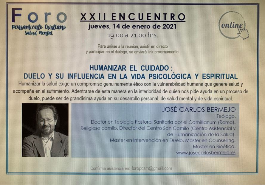 El 14 de enero, José Carlos Bermejo participará en el Foro de pensamiento cristiano con una intervención donde presentará el duelo y su influencia en la vida psicológica y espiritual de las personas. La humanización del cuidado contribuirá a prevenir alteraciones de salud mental.