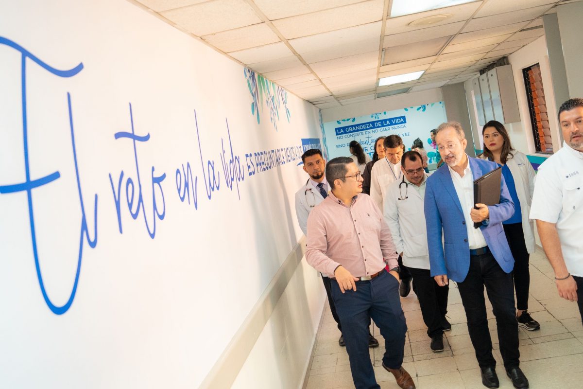 Bella ambientación que humaniza los espacios del Hospital General de San Salvador del ISSS visitado por José Carlos Bermejo de la mano de los directivos.