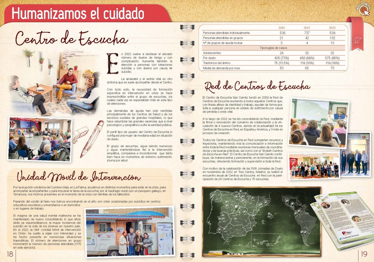 Durante el año 2022, el Centro de Escucha San Camilo ha destacado por atender un alto número de duelos riesgosos y complicados, así como brindar apoyo a personas con ideaciones suicidas y duelos relacionados con el suicidio. Además, se centra en abordar la ansiedad, el estrés vital y la formación en intervención en crisis.
