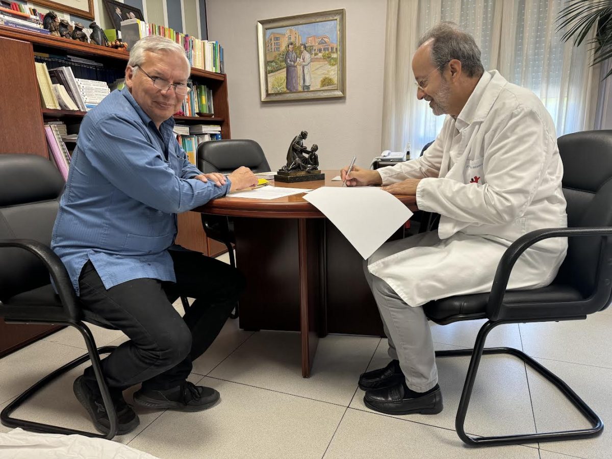El Dr. Ricardo Fábregas, decano de Facultad, y José Carlos Bermejo terminan la firma del Convenio de colaboración entre la Universidad Santo Tomás de Chile y el Centro de Humanización de la Salud de la Salud de los camilos de Tres Cantos. Se refuerza así la alianza para la colaboración en materia de formación.