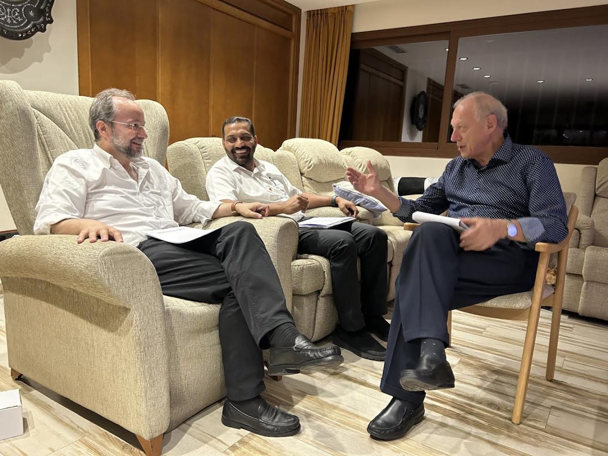 Los superiores provinciales de India y España estrechan relaciones firmando convenio de colaboración camiliana en Tres Cantos: Bijoy y Bermejo, apoyados por Mateus en Barcelona.