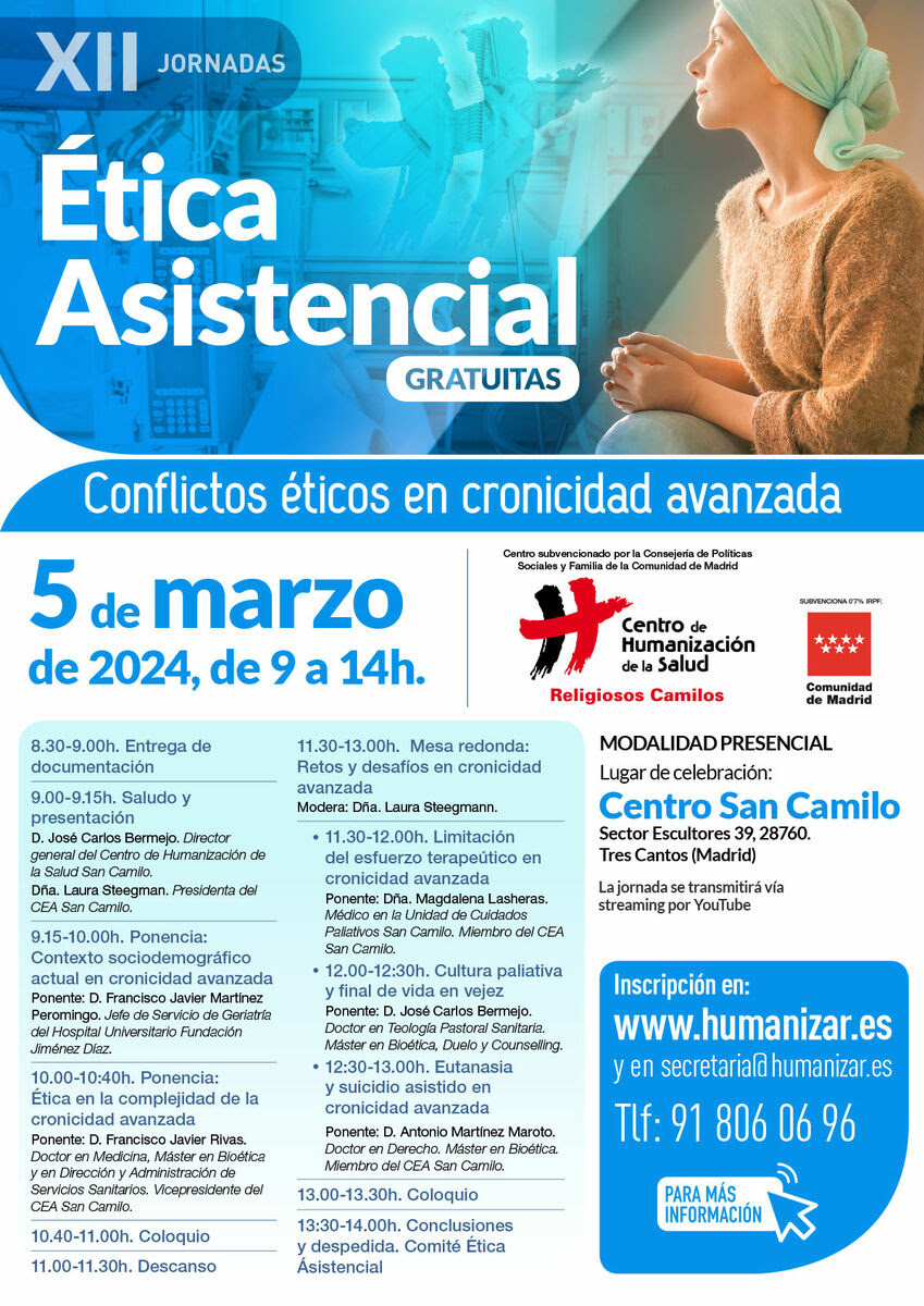 El próximo 5 de marzo 2024, en San Camilo, Tres Cantos, Madrid, organizadas por el Comité de Ética Asistencial del Centro, se celebrarán las XII Jornadas sobre conflictos éticos en cronicidad avanzada. José Carlos Bermejo impartirá una conferencia sobre "Cultura paliativa y final de vida en la vejez". Inscripciones en www.humanizar.es