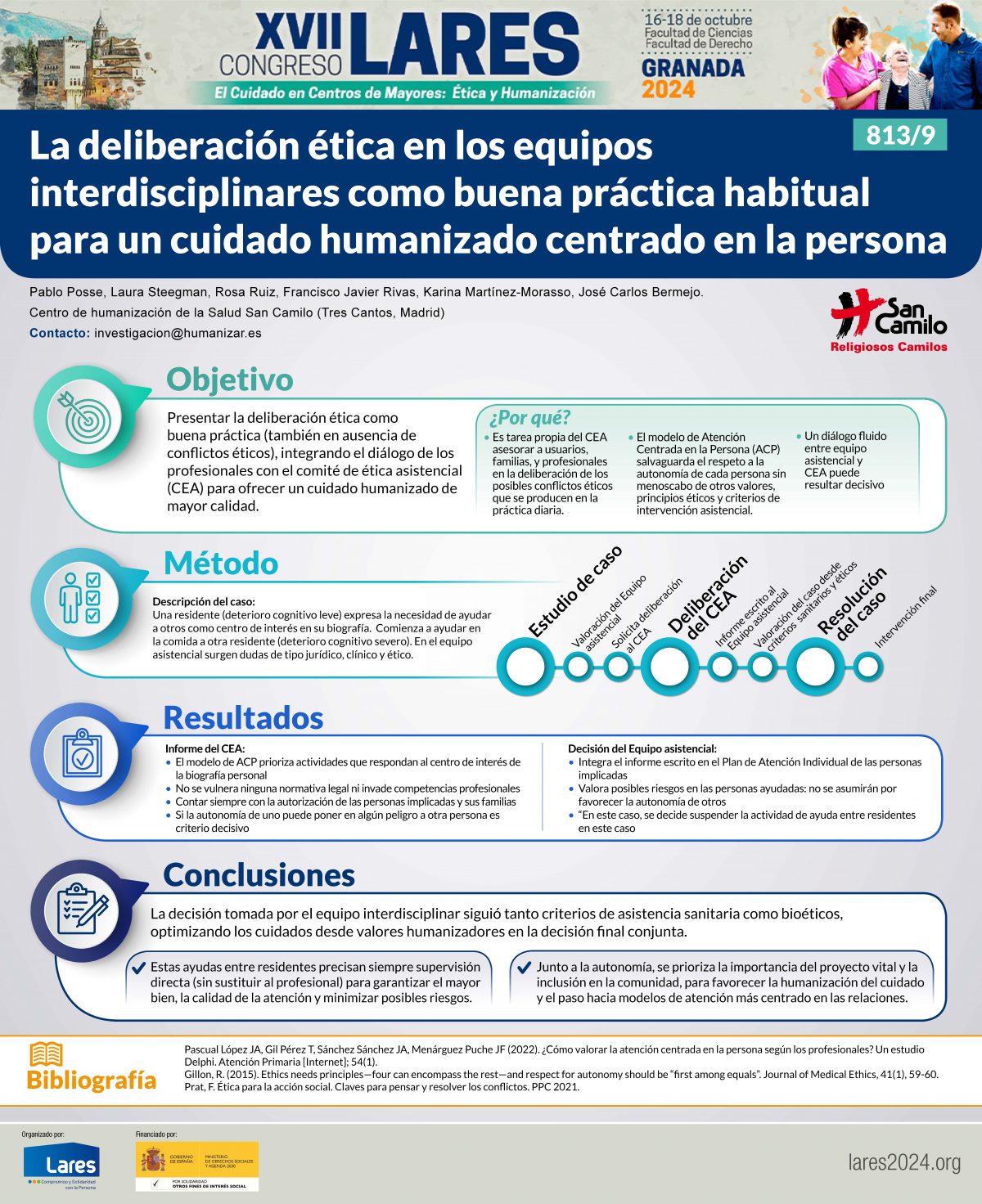 En el marco del XVII Congreso LARES celebrada los días 16 al 18 de octubre en Granada, el Centro de Humanización de la Salud San Camilo, ha presentado el póster titulado "La deliberación ética en los equipos interdisciplinares como buena práctica habitual para un cuidado humanizado centrado en la persona". Este trabajo, de José Carlos Bermejo y su equipo, pone de relieve la importancia de la deliberación ética dentro de los equipos interdisciplinares en la atención a personas mayores, buscando siempre la mejor calidad de cuidado basada en principios bioéticos y humanizadores