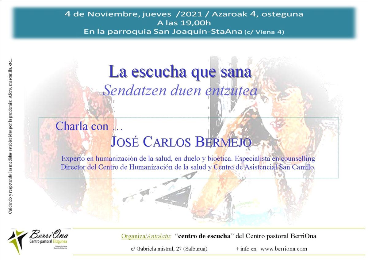 El próximo jueves 4 de noviembre a las 19:00 hs, en la Parroquia San Joaquín y Santa Ana de Salburia (Vitoria Gasteiz) José Carlos Bermejo, impartirá la conferencia “La escucha que sana", donde presentará algunas claves esenciales en el acompañamiento de las personas.