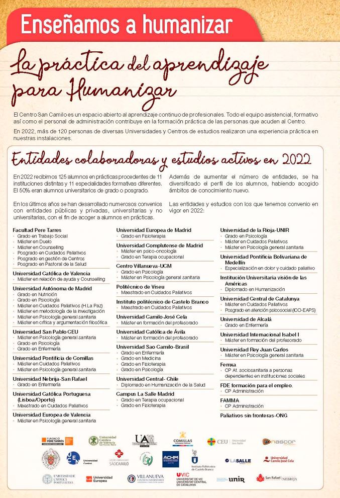 En el año 2022, más de 120 personas provenientes de diversas universidades y centros de estudios tuvieron la oportunidad de realizar una experiencia práctica en el Centro San Camilo. Este número incluyó a 125 alumnos en prácticas provenientes de 11 instituciones diferentes y que se especializaban en 11 áreas formativas distintas. Es importante destacar que el 50% de estos alumnos eran universitarios de grado o posgrado.