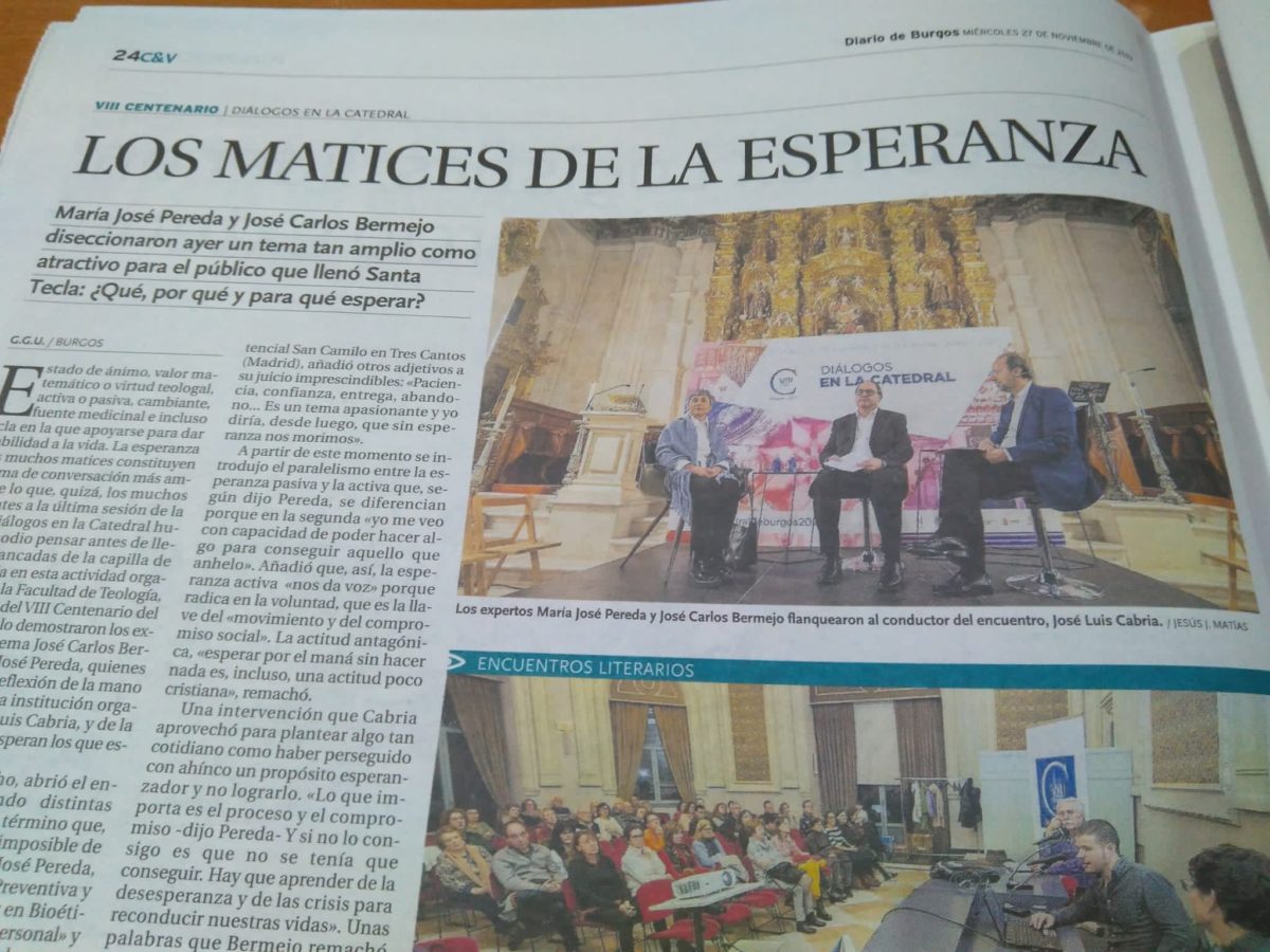 Es el eco del Diario de Burgos sobre la sesión de Diálogos en la Catedral, celebrados el 26 de noviembre y moderados por José Luis Cabria. Participaron en la sesión José Carlos Bermejo y la Dra. María José Pereda. Una sesión de profundizadión y despliegue de los elementos de la esperanza como dinamismo sanante, transcultural, transhistórico y protector en las experiencias de sufrimiento humano.