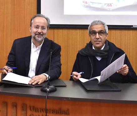El Rector de la Universidad Católica Silva Enríquez, Dr. Galvarino Jofré Araya y el Director del Centro de Humanización de la Salud San Camilo, José Carlos Bermejo, firman un convenio en Santiago de Chile, como marco de la colaboración próxima entre ambas instituciones en materia de formación e investigación. José Carlos Bermejo ha impartido una conferencia en la sede de la Universidad, en la Facultad de Ciencias Sociales.