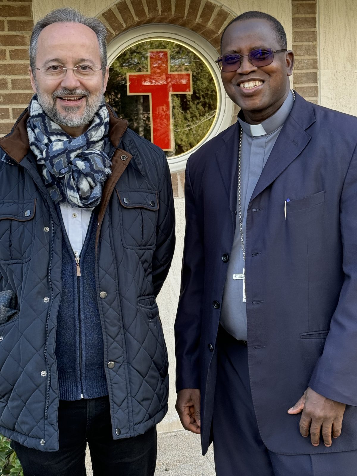 Monseñor Prosper Kontiebo, obispo de la capital de Burkina Faso, Ouagadougou, visita la comunidad camiliana de Tres Cantos, como religioso camilo que es. Le recibe fraternalmente José Carlos Bermejo, Superior Provincial de España.