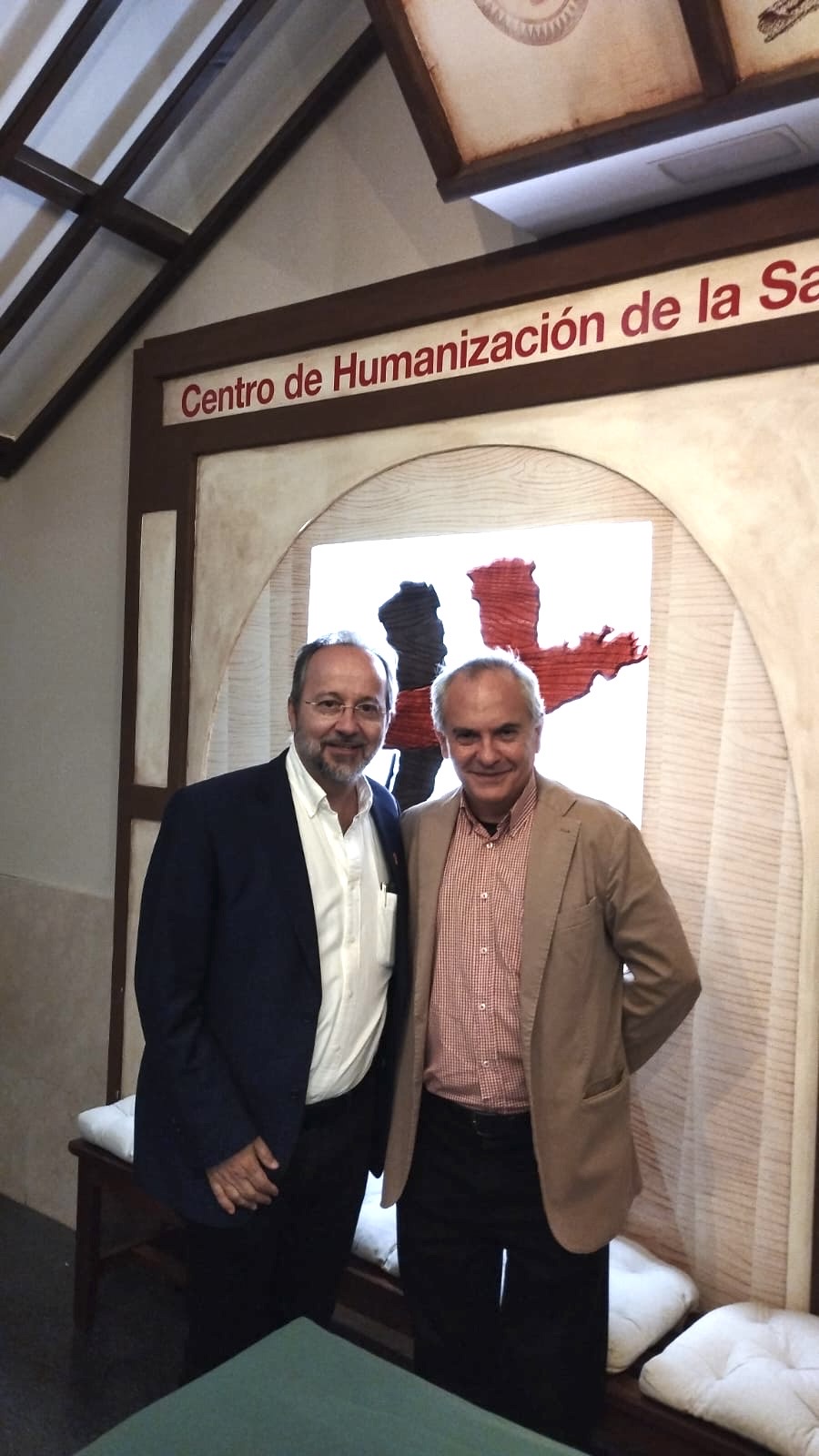En las Jornadas de Paliativos que se celebran en San Camilo, el Dr. Pablo D'Ors, fundador de "Amigos del desierto", ha impartido una conferencia sobre "Cómo transformar el sufrimiento en esperanza" desde la práctica de la autoconciencia y el silencio interior. Ha encontrado a José Carlos Bermejo, compañero de estudios en Colmenar Viejo.