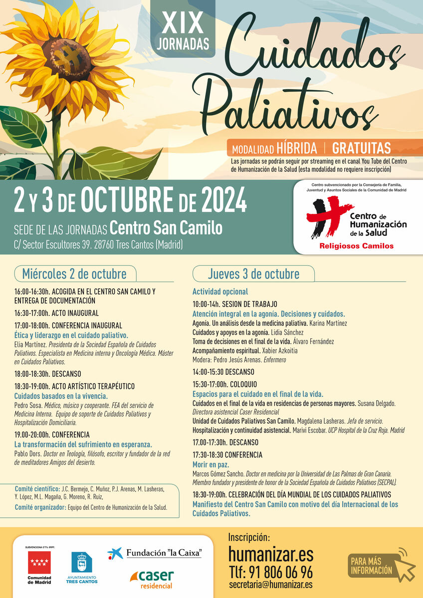 Además del posgrado universitario en Cuidados Paliativos, en San Camilo de Tres Cantos, se celebrarán en octubre las XIX Jornadas de Cuidados Paliativos, contando con Marcos Gómez Sancho, Elia Martínez, Pedro Sosa, Magdalena De Las Heras, Pablo D'Ors, Xabier Azkoitia, entre otros. Jornadas que inaugurará José Carlos Bermejo.