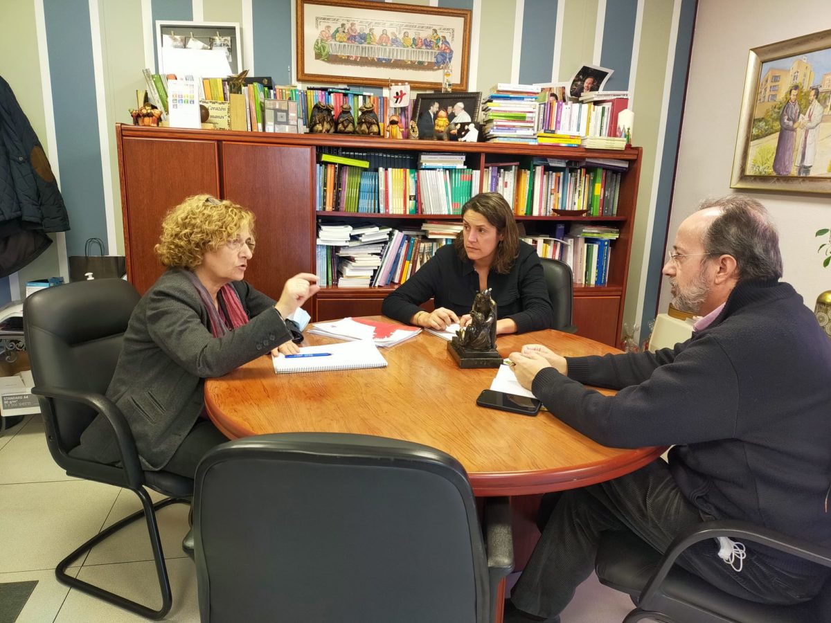 Felicidad Vicente, coordinadora de postgrados, Cristina Muñoz, responsable de formación del Centro de Humanización de la Salud y José Carlos Bermejo, director académico, revisan los postgrados del Centro en Tres Cantos, Madrid.