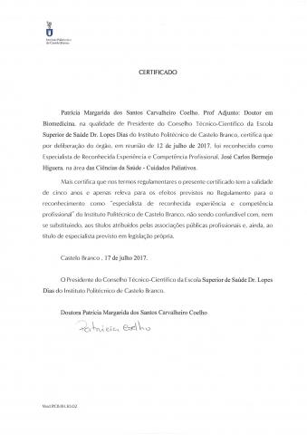 El Consejo Científico de la Escuela de Ciencias de la Salud del Instituto Politécnico de Castelo Branco, Portugal, reconoce a José Carlos Bermejo, Especialista de Reconocida Experiencia en Cuidados Paliativos. Es un tipo de reconocimiento significativo dentro de la comunidad académica a la vista del curriculum y vida profesional y universitaria recorrida. El profesor Dr. José Carlos Bermejo imparte clases en dicha Escuela en el máster universitario en cuidados paliativos, en particular, sobre comunicación y manejo de situaciones difíciles desde el punto de vista relacional. (Ver documento)