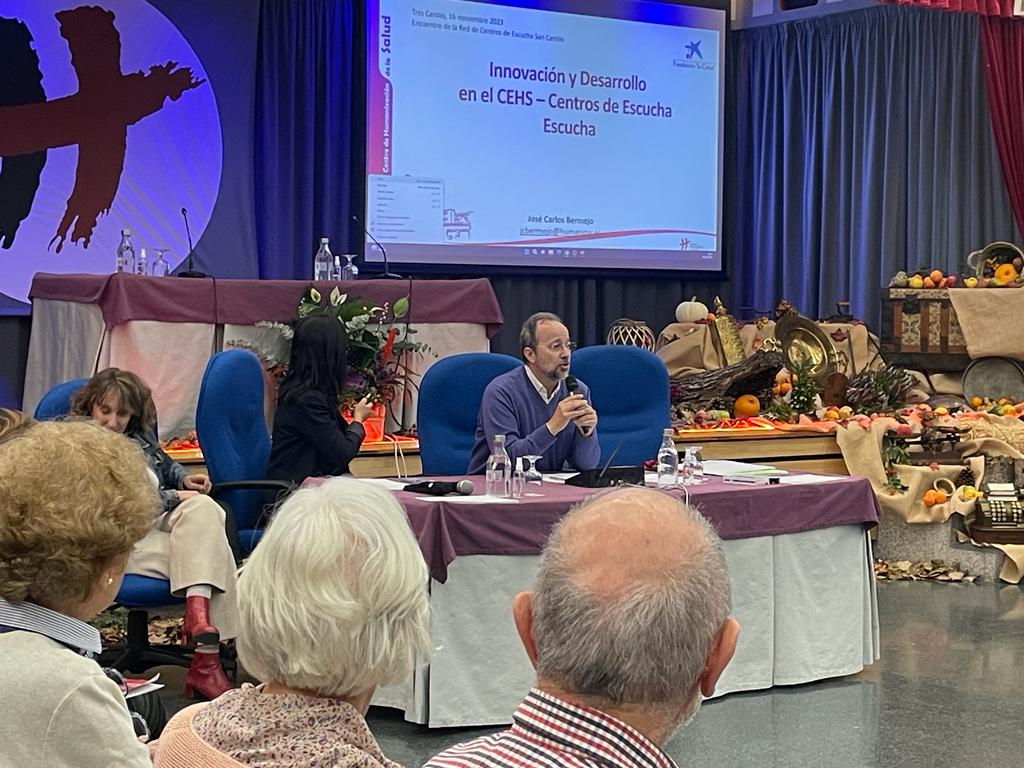 Los 34 Centros de Escucha de España y algunos de América Latina se encuentran en San Camilo para chequear la actividad realizada durante el año, reforzar la identidad, especificarla y conocer otras iniciativas existentes de acompañamiento en el duelo. La especificidad del respaldo de los posgrados universitarios, los estudios de investigación realizados, las publicaciones, la historia y su accesibilidad para los servicios sociales y de salud, da a los Centros de Escucha parte de su identidad. Los Centros han acompañado a más de 1.400 personas, tanto individualmente como en grupos, con la metodología del counselling. José Carlos Bermejo, fundador del primero, presenta la historia del desarrollo de las áreas temáticas en la última década y los estudios publicados en los últimos años, particularmente sobre duelo y sufrimiento.