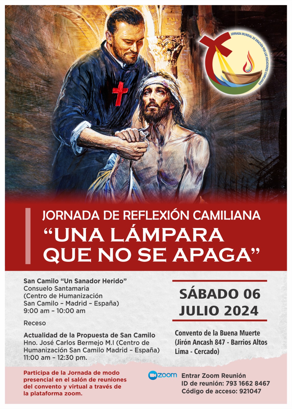 El próximo sábado 6 de julio, los religiosos camilos de la Viceprovincia de Perú organizarán una jornada de reflexión camiliana bajo el lema "Una lámpara que no se apaga". El evento contará con la intervención de José Carlos Bermejo, director del Centro de Humanización de la Salud, quien presentará la reflexión "Actualidad de la propuesta de San Camilo". Además, Consuelo Santamaría, profesora del mismo centro, ofrecerá la conferencia "San Camilo, un sanador herido". La actividad se llevará a cabo de manera presencial en el salón de reuniones del Convento de la Buena Muerte en Lima, Perú, y también será accesible a través de la plataforma Zoom.