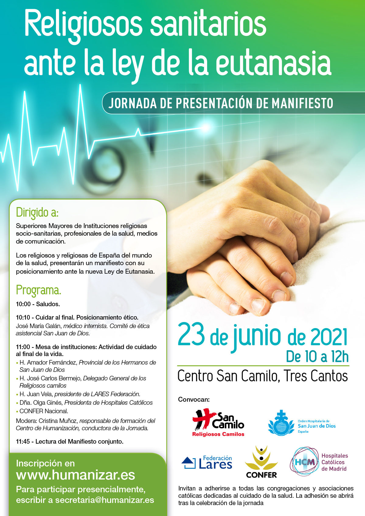 El próximo 23 de junio, en el centro San Camilo de Tres Cantos, representantes de San Juan de Dios, Camilos, Fundación Lares, CONFER y Hospitales Católicos, pronunciarán un manifiesto conjunto ante la entrada en vigor de la Ley de eutanasia. José Carlos Bermejo representará a los camilos de España. Para inscribirse, en: www.humanizar.es