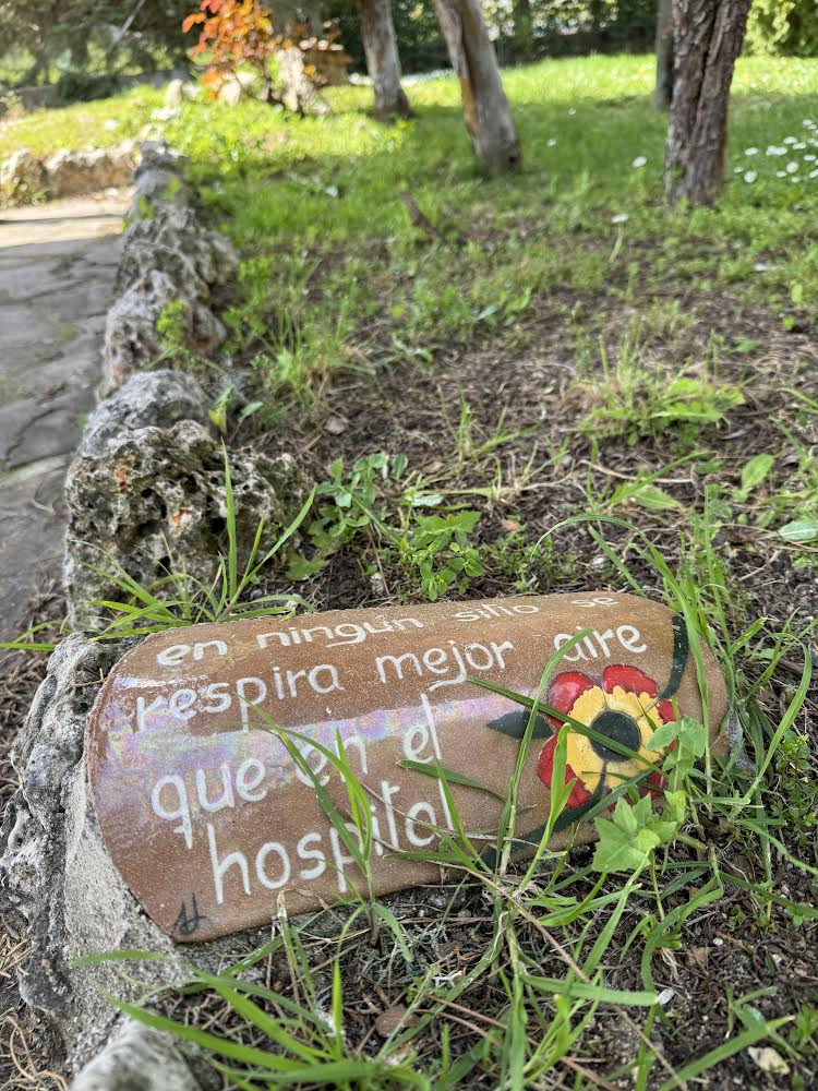 Es frase de San Camilo: "En ningún sitio se respira mejor aire que en el hospital". En el jardín de Tres Cantos, José Carlos Bermejo ha puesto las frases más provocadoras para la humanización de San Camilo de Lellis.