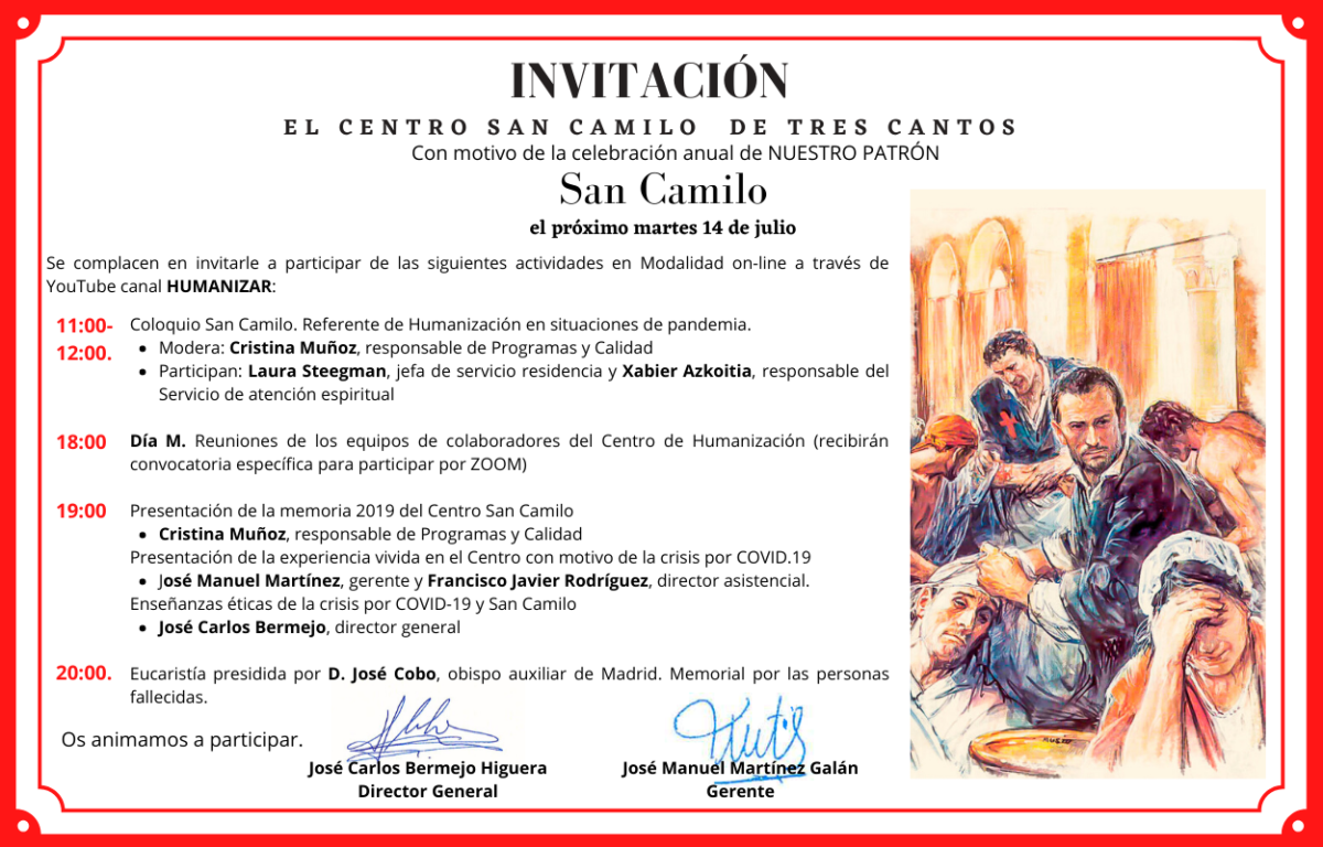 El Centro San Camilo celebrará el día 14 de julio su fiesta. Esta vez, on-line para la mayoría de los que deseen participar, con respeto a la situación. El programa dará la posibilidad de conocer también la memoria de 2019. José Carlos Bermejo presentará una reflexión sobre "Enseñanzas éticas de la crisis por COVID-19".