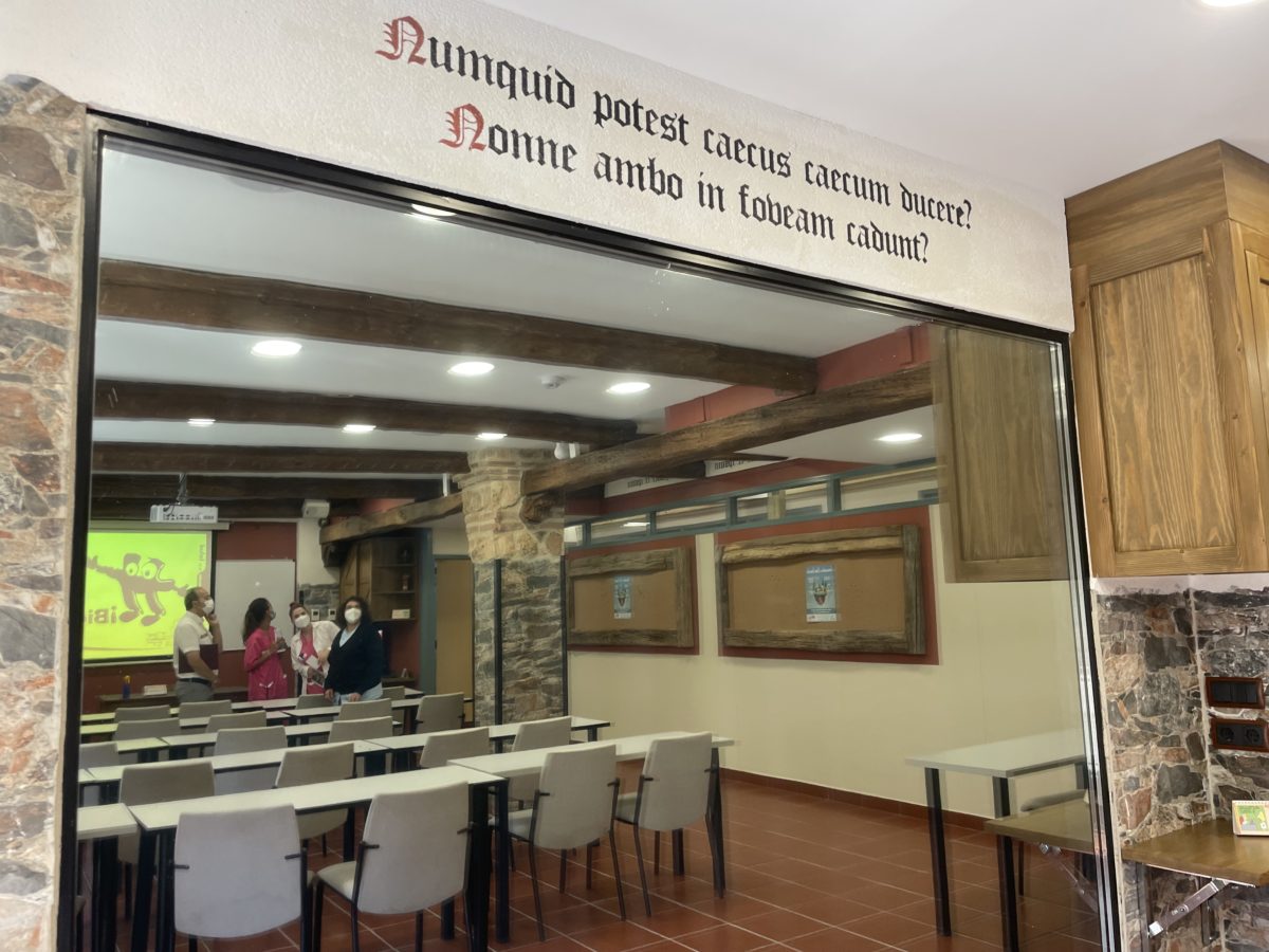Las aulas del pasillo llevan nombres y citas referidas a la noble fuente de la sabiduría: los evangelios. Con nombres en español y en griego que nos llevan a más información a través de diversos códigos QR.