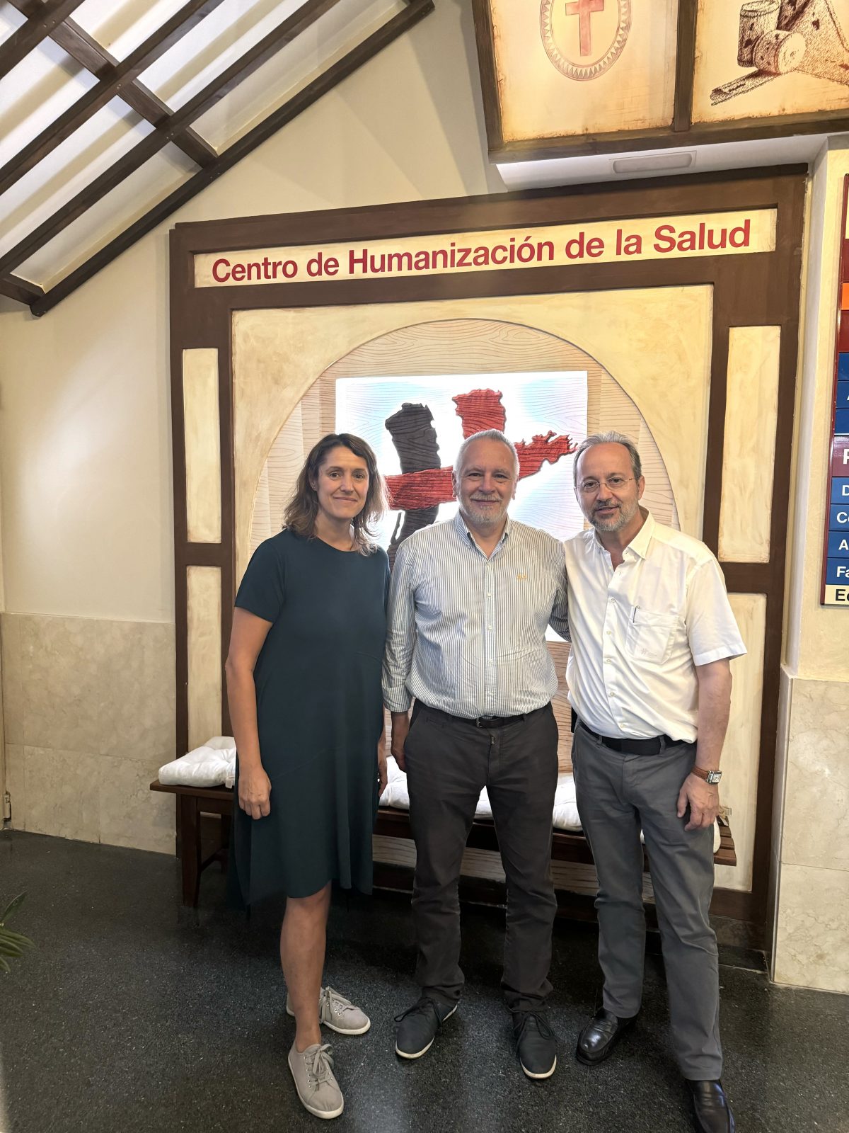 Sergio A. König, profesor de la Universidad Católica Cardenal Silva Henríquez, en Chile, visita el Centro de Humanización de la Salud en Tres Cantos, Madrid, compartiendo con Cristina Muñoz y José Carlos Bermejo las claves del Centro, también en humanización de espacios.