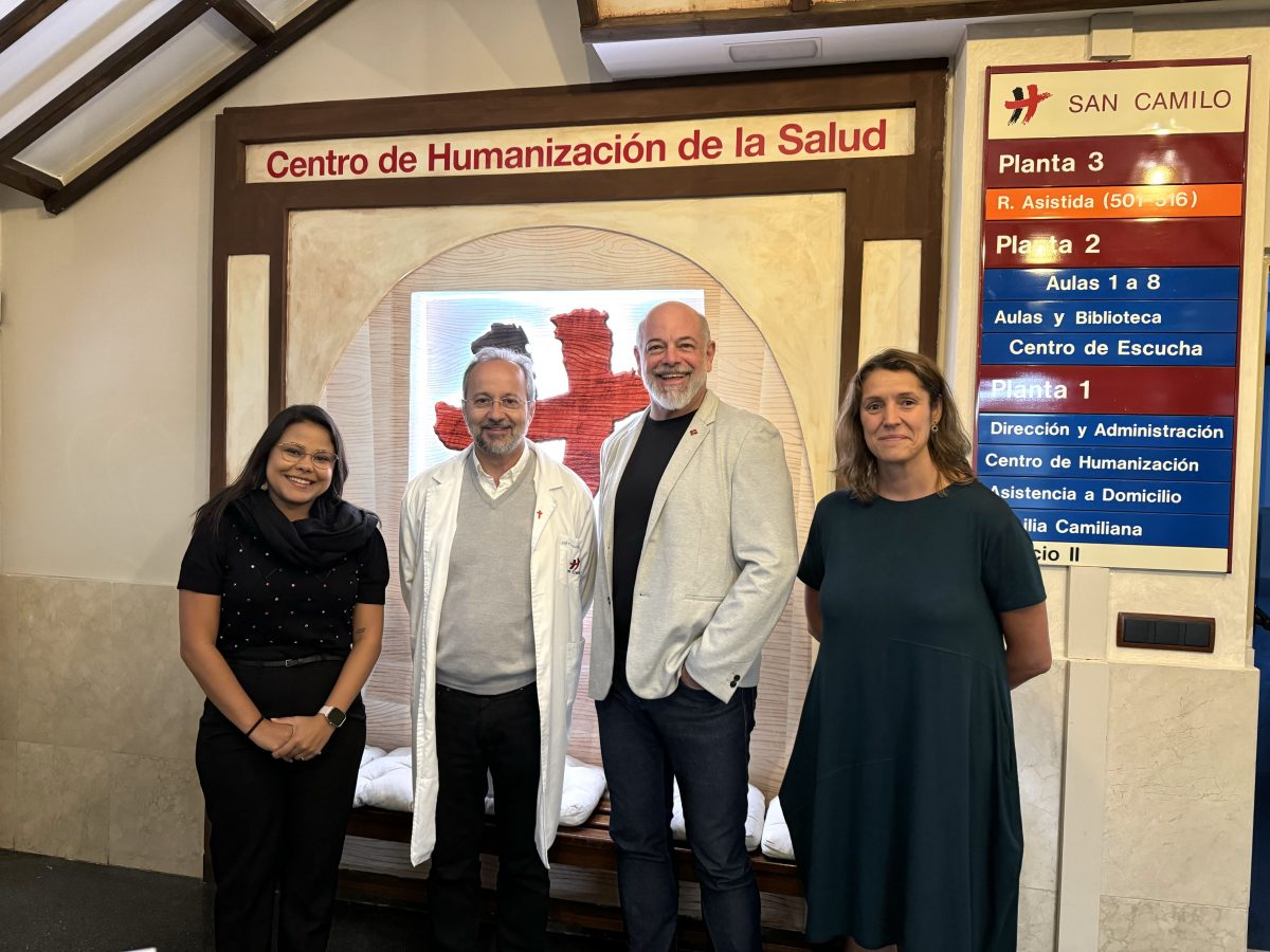 Carlos Ferrara, decano y Rayssa Rios, responsable de relaciones internacionales de la Universidad San Camilo de Brasil, visitan a los profesionales del Centro San Camilo de Tres Cantos y se réunen con el equipo de formación, de investigación, del Centro de Escucha y Asistencial, coordinados por Cristina Muñoz. Les da la bienvenida José Carlos Bermejo, reforzando la alianza.