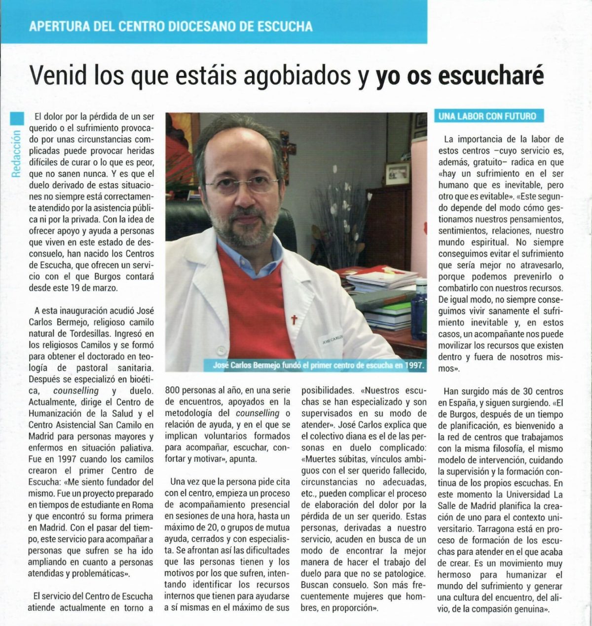 Es el titulo del reportaje a José Carlos Bermejo, con motivo de la apertura del nuevo Centro Diocesano de Escucha San Camilo en Burgos. Se trata de un espacio y servicio gratuito que tiene como objetivo ayudar a las personas que están pasando por una situación de sufrimiento o crisis (duelo, pérdidas, personas con un familiar enfermo, soledad, situación familiar o personal difícil…). Nace inspirado, y en colaboración, con el Centro de Humanización de la Salud de Madrid, incorporándose a los más de 30 centros que existen en diversas ciudades de España.
