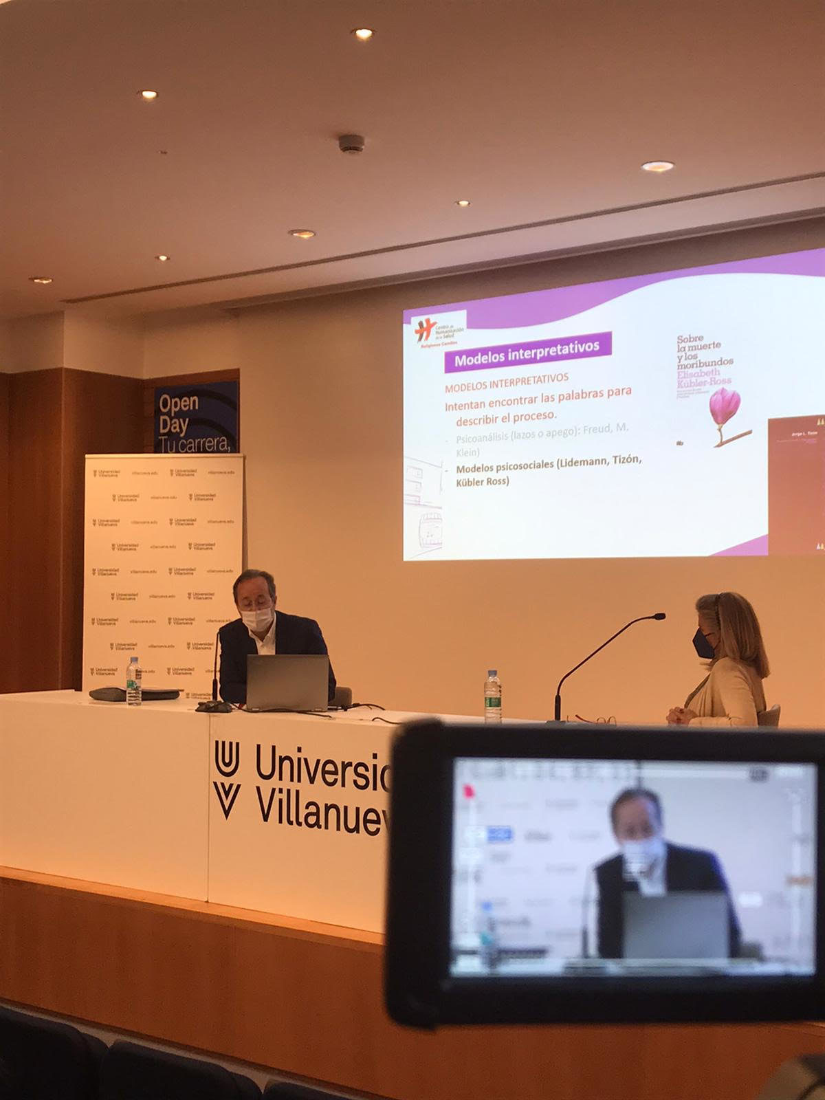 En la facultad de psicología de la Universidad de Villanueva, 70 personas, además de 120 online, participaban en el salón de actos en la conferencia impartida por José Carlos Bermejo sobre Duelo: desafíos de actualidad en clave de pedagogía e intervención.